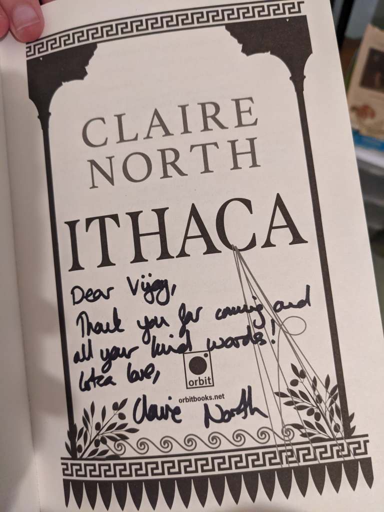 So yes, I’m not overly looking forward to this coming winter. I do admittedly have a few fun things lined up; a couple of plays I’m going to see in London, and the wedding of a long-time friend which I can’t wait for. I managed to bust out of the gate a few times in September, going to London for a couple of book signings I didn’t want to miss. After meeting the lovely Elodie Harper and getting her to sign my copy of The House With The Golden Door in May, over the last few weeks I was able to meet her again, alongside Jennifer Saint and Claire North, where I picked up a signed copy of the latter’s new book Ithaca.
