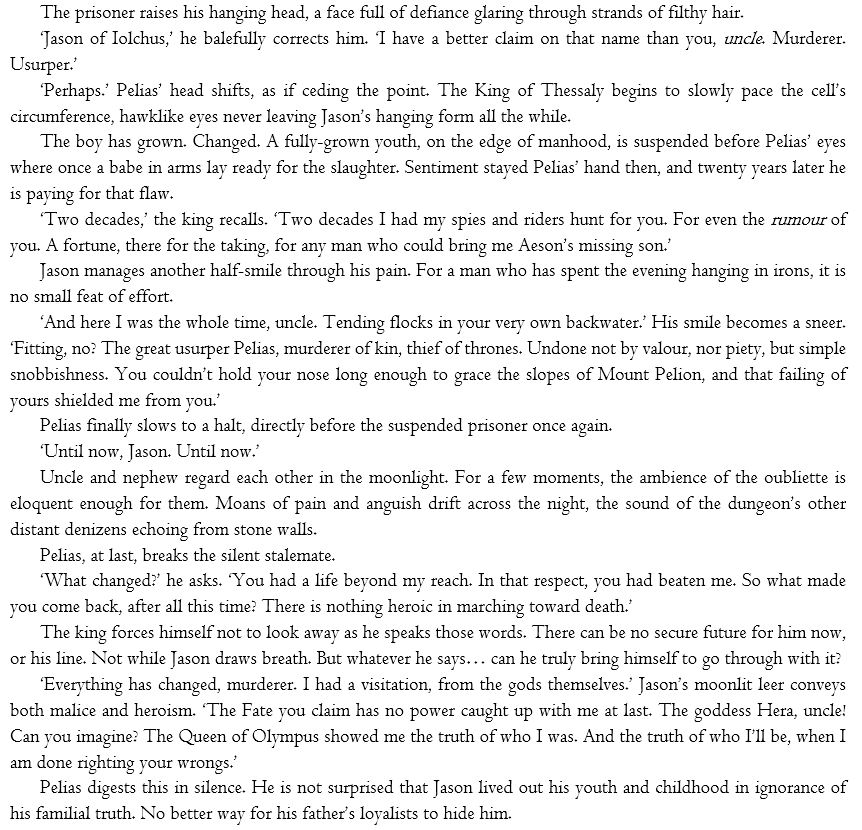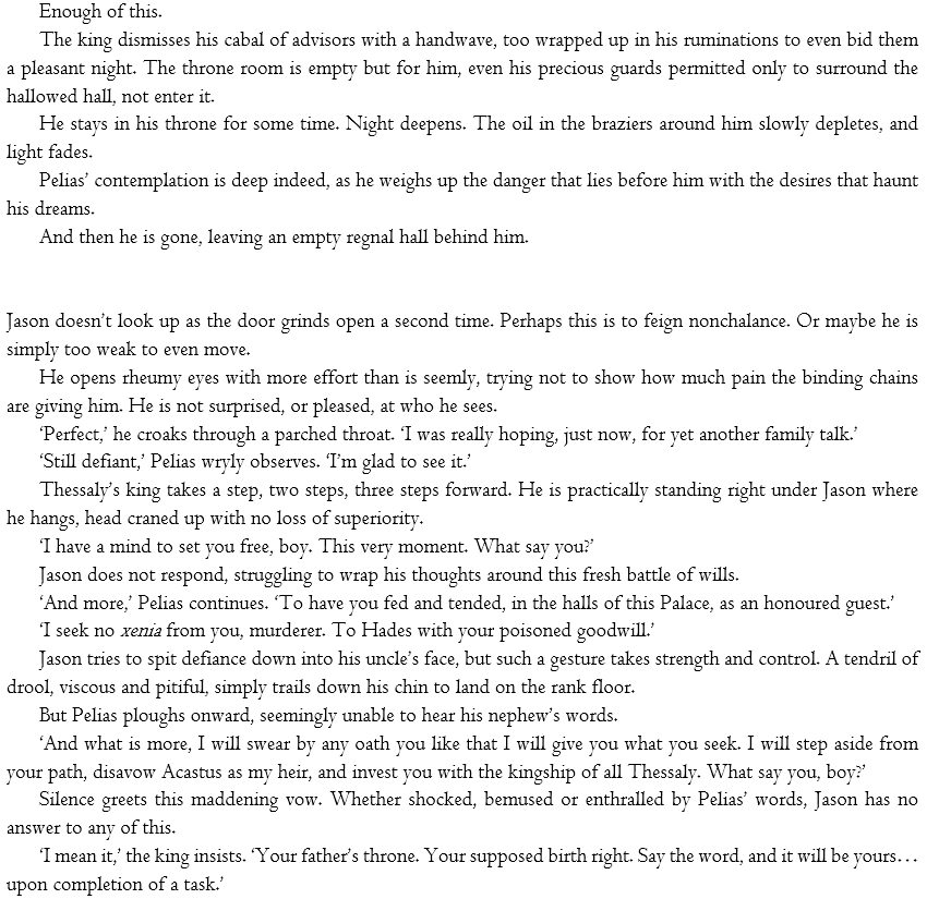 A big moment, fo sho. I’m not quite as jubilant as I ought to be, as while this speed of progress is good, I’ve felt the plot has dragged a little in recent Chapters. The Argo is clear of the Clashing Rocks. Fiiiiinally… this actually became a joke to my close friends, with me sending a new snapshot with every 1k milestone followed by the words ‘and they’re still in the f**king Rocks!’ until about now.
