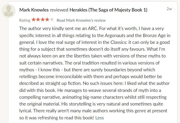 Finally, Mark Knowles (of Blades of Bronze fame) left a very kind review for me on Goodreads, which was an unexpected surprise. As anyone who peruses this genre will know, Mark’s recent trilogy reimagines the Jason and the Argonauts story in a very different, altogether more historically and archaeologically feasible fashion. Crucially, Mark has actually sailed on a replica of the Argo herself, on a trail that (more or less) follows the route the original Argonauts might have taken on their quest. Consequently, he actually knows a great deal about Bronze Age sailing, something that is glaringly evident from even a cursory read of his series. By contrast, I myself know very little, and blagged it at great length by having my Argo made of magical wood, with an animal will of its own, and oars that more often than not work by themselves. Mr Knowles, as I’ve discovered over the last year or so via Twitter DMs, is also a very insightful and charming fella.